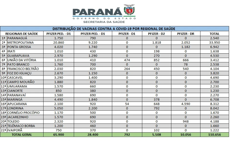 VACINAÇÃO – Segundo os dados do Vacinômetro, o Paraná já aplicou 20.733.508 vacinas contra a Covid-19, sendo 9.377.898 primeiras doses (D1) e 8.699.615 segundas doses (D2) ou doses únicas (DU). O Estado registra ainda a aplicação de 205.136 doses adicionais (DA), 2.626.598 doses de reforço (DR) e 221.190 doses do público infantil.
