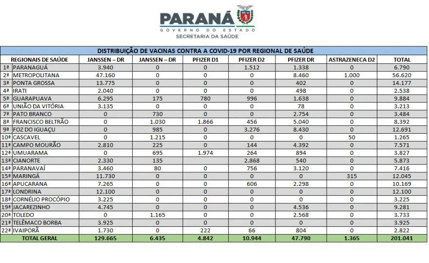 A Secretaria de Estado da Saúde (Sesa) descentraliza nesta quarta-feira (15), por via terrestre, 201.041 vacinas contra a Covid-19 para as suas Regionais no Paraná. Os imunizantes são referentes às 72ª e 73ª pautas do Ministério da Saúde.