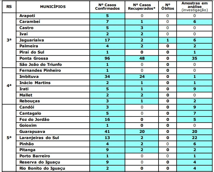 Confira os números da 3ª, 4ª e 5ª Regionais de Saúde, que abrangem os municípios da região.
