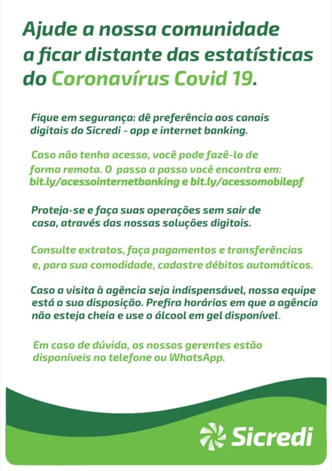 Nas redes sociais, o Sicredi pede que os usuários dêem preferência para os canais digitais, como internet banking e app. Lá é possível consultar extratos, fazer transferências e pagamentos com comodidade e sem sair de caso.