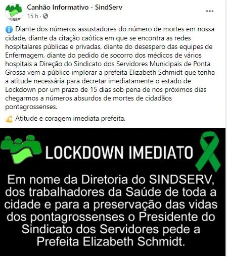 "Diante do pedido de socorro dos médicos de vários hospitais, a Direção do Sindicato dos Servidores Municipais de Ponta Grossa vem a público implorar a prefeita Elizabeth Schmidt que tenha a atitude necessária para decretar imediatamente o estado de lockdown por um prazo de 15 dias sob pena de nos próximos dias chegarmos a números absurdos de mortes de cidadãos ponta-grossenses", escreveu o Sindicato.