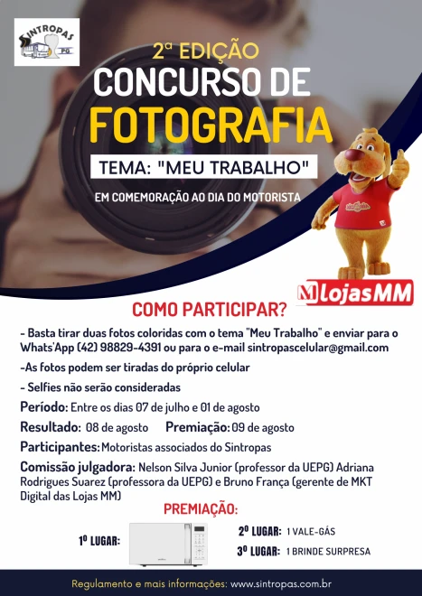 O Sintropas está promovendo a 2ª edição do concurso de fotografia amadora, em comemoração ao Dia do Motorista, celebrado hoje (25). A iniciativa está sendo realizada com apoio das lojas Mercado Móveis, que vão premiar o primeiro colocado com um micro-ondas. O segundo lugar ganhará um vale-gás e o terceiro um prêmio surpresa. A participação é gratuita e pode ser feita até o dia 1º de agosto por motoristas de empresas do transporte coletivo que são associados ao sindicato. Mais informações no
