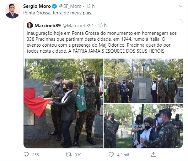 Na noite de sexta-feira (17), o ex-ministro da Justiça e ex-juiz federal Sergio Moro compartilhou em suas redes sociais uma publicação sobre a cerimônia de inauguração de um monumento que homenageia os pracinhas ponta-grossenses que lutaram na Segunda Guerra Mundial. Na legenda Moro escreveu: "Ponta Grossa, terra de meus pais".
