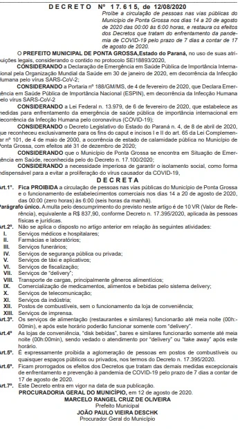 A Prefeitura de Ponta Grossa através do Diário Oficial do Município prorrogou nesta quinta-feira (13) o toque de recolher entre os dias 14 a 20 de agosto.