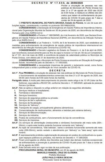 A Prefeitura de Ponta Grossa através do Diário Oficial do Município prorrogou nesta quinta-feira (20) o toque de recolher entre os dias 21 a 27 de agosto.