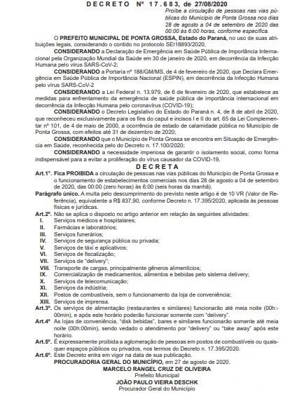 A Prefeitura de Ponta Grossa através do Diário Oficial do Município prorrogou nesta quinta-feira (27) o toque de recolher entre os dias 28 de agosto a 4 de setembro.