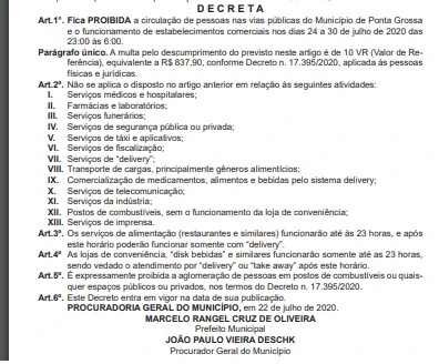 A Prefeitura de Ponta Grossa através do Diário Oficial do Município prorrogou nesta quinta-feira (23) o toque de recolher por mais sete dias, entre 24 e 30 de julho.