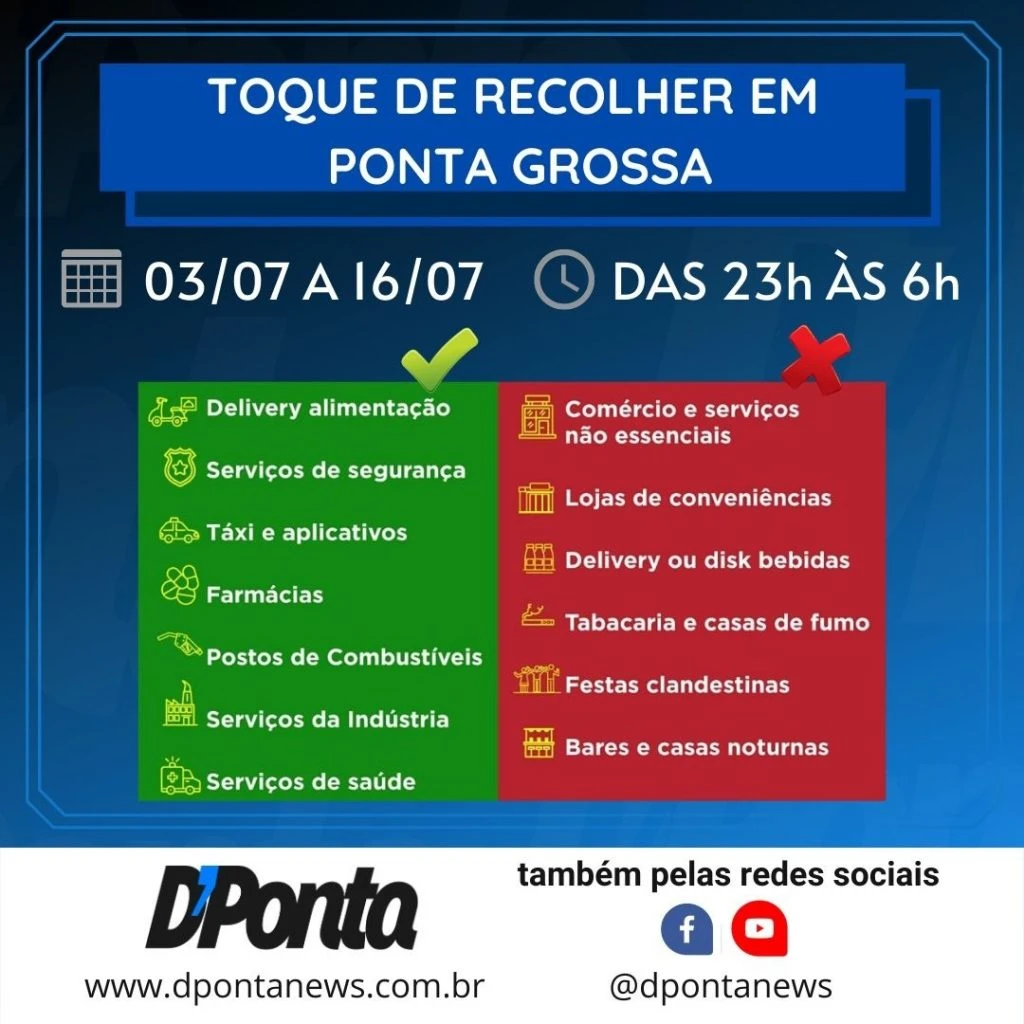 Ponta Grossa terá toque de recolher entre os dias 3 e 16 de julho. A decisão foi publicada no Diário Oficial do município na edição de quinta-feira (02) e passa a valer a partir desta sexta-feira (03).