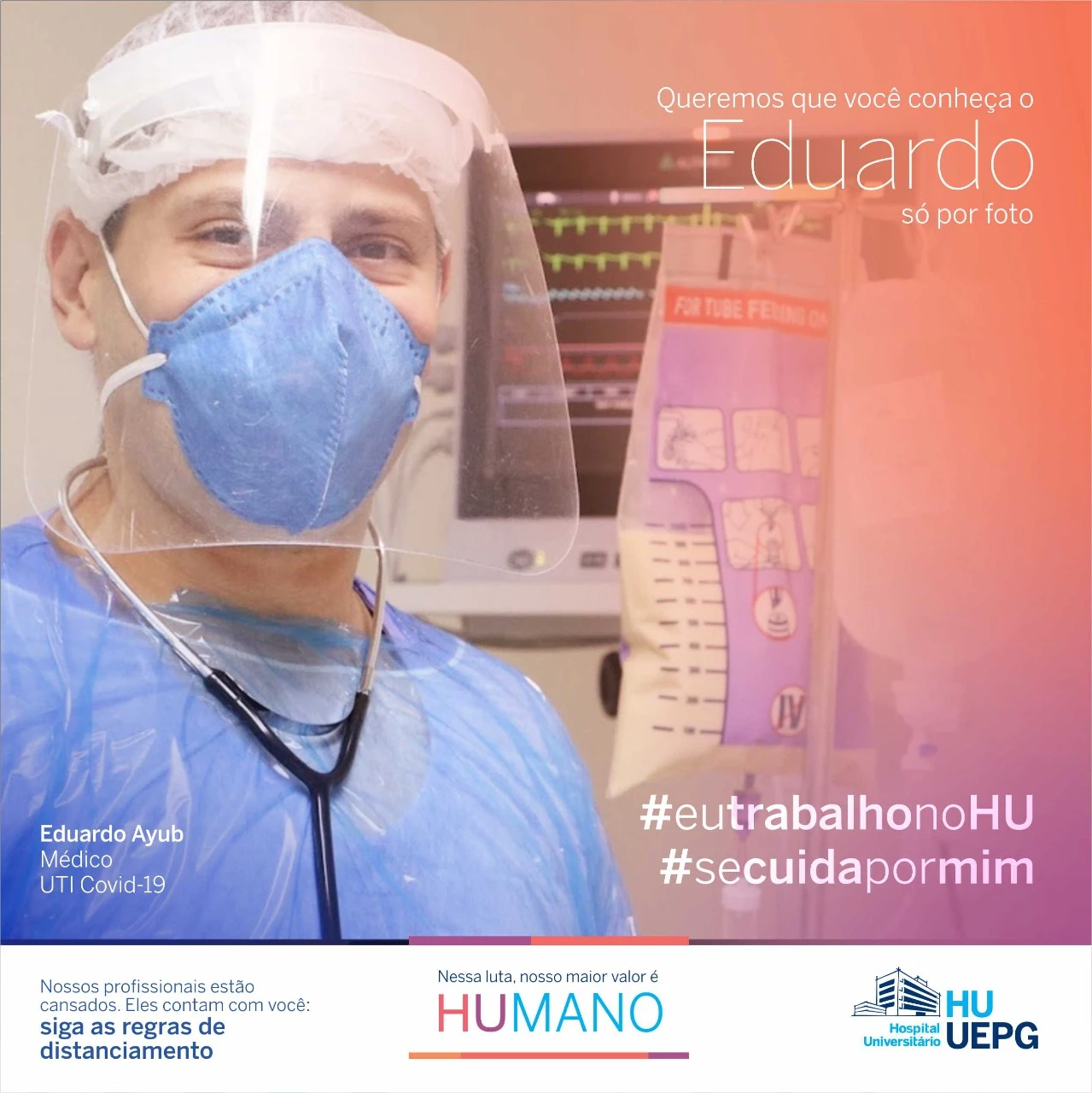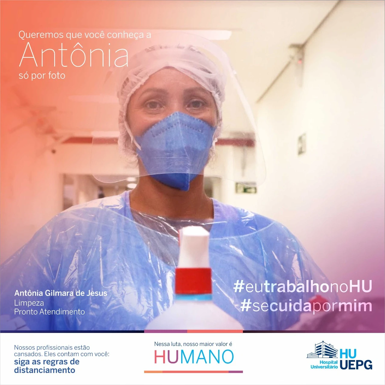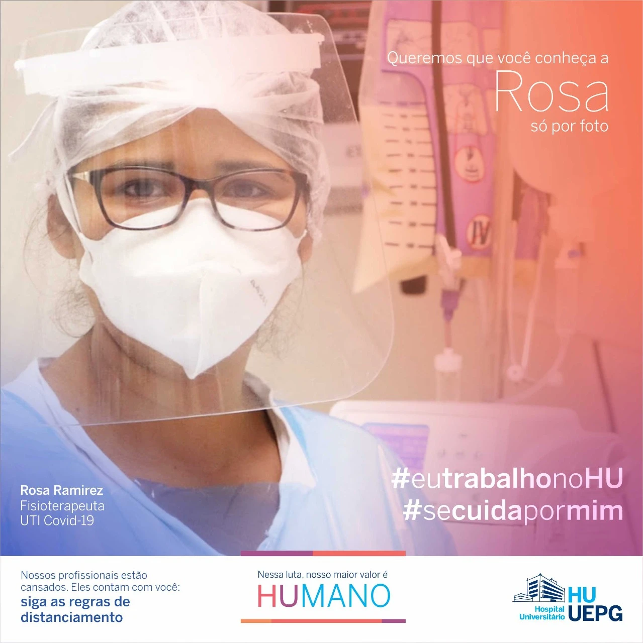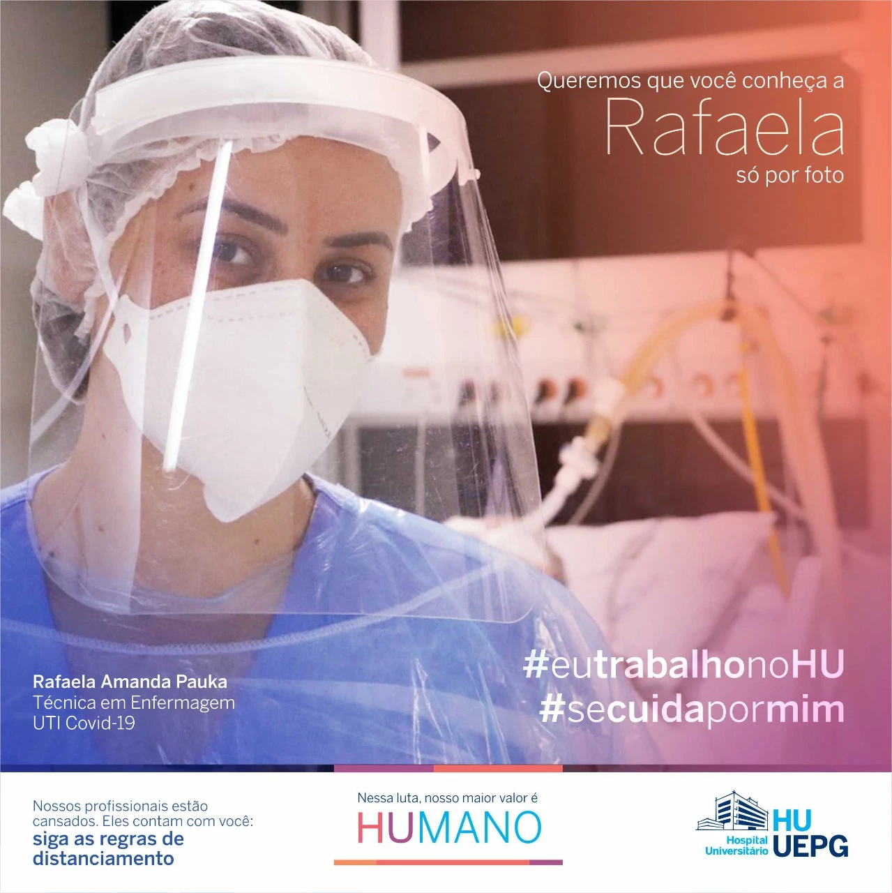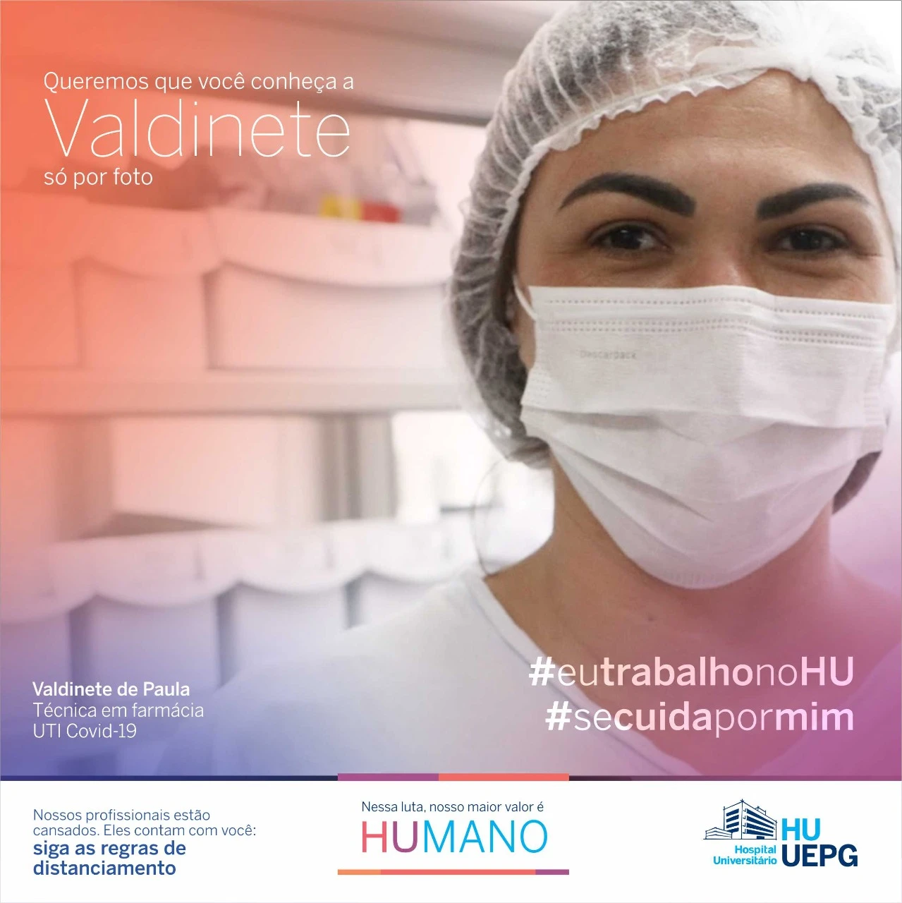 As peças são personalizadas com o nome, profissão e setor onde o servidor trabalha: “Queremos que você conheça nossos profissionais só por foto”. Com as hashtags #eutrabalhonoHU e #secuidapormim, a campanha busca, ao mesmo tempo, valorizar o trabalho e dedicação dos profissionais de saúde dos hospitais da UEPG e conscientizar a população sobre as medidas para conter a pandemia, que atinge altos números na região neste início de 2021.