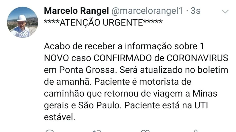 O prefeito Marcelo Rangel informou nas redes sociais na noite desta segunda-feira, 13, que Ponta Grossa registrou um novo caso de paciente contaminado com o coronavírus. As primeiras informações dão conta de que seria um caminhoneiro que retornou de viagem a Minas Gerais e São Paulo. O prefeito informou ainda que o paciente está internado na UTI e estável.