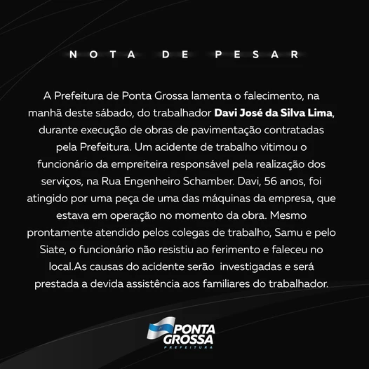 No final da manhã, a Prefeitura de Ponta Grossa emitiu uma nota de pesar pelo falecimento do trabalhador.