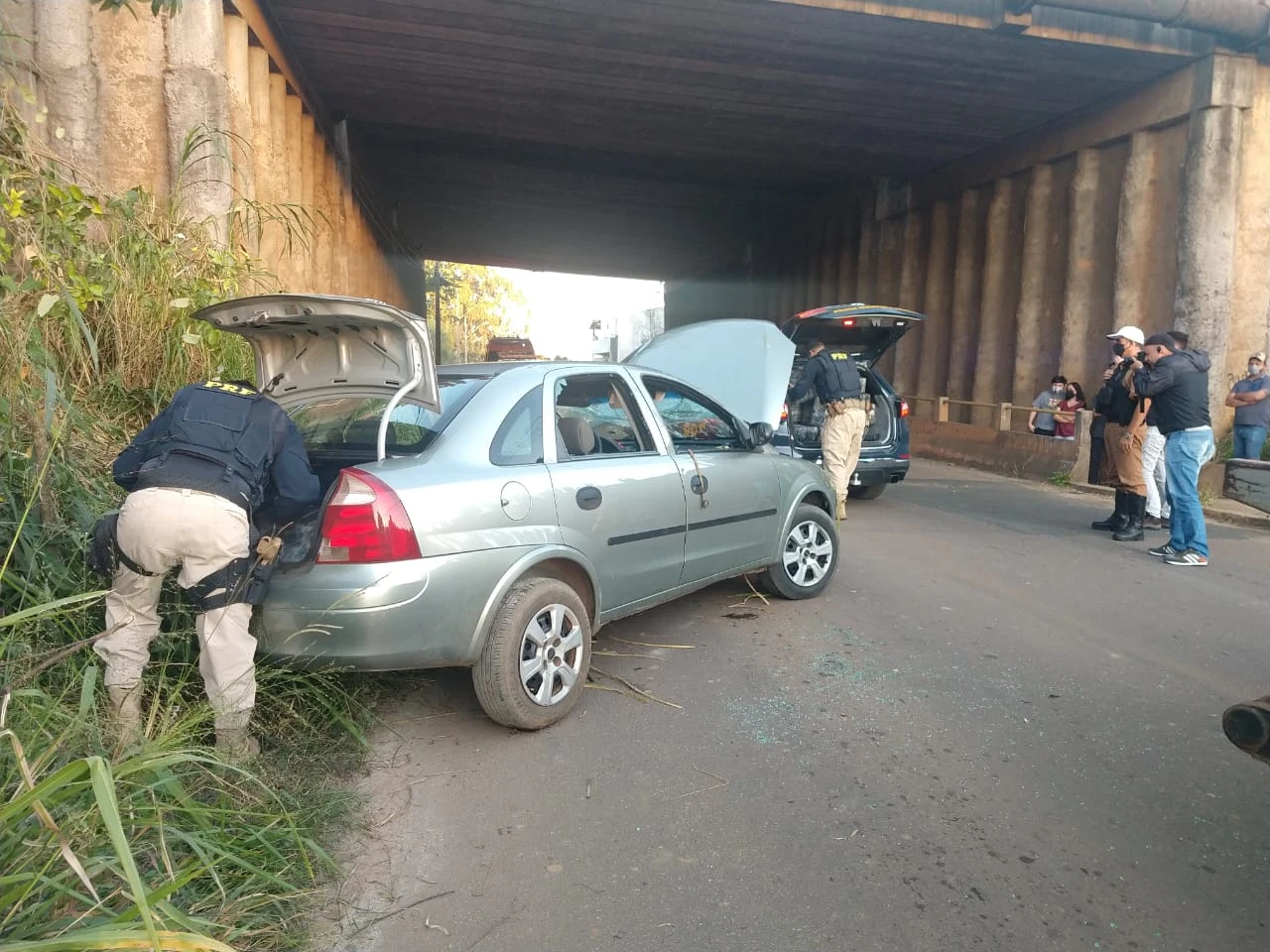 Na tarde deste domingo (21), equipes do Corpo de Bombeiros e do Samu prestaram apoio a uma ocorrência de perseguição policial pela PRF, seguida de colisão e queda de veículo. O carro do suspeito caiu da trincheira/viaduto do Santa Paula