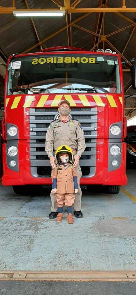Veja a foto do jovem Miguel junto ao Corpo de Bombeiros