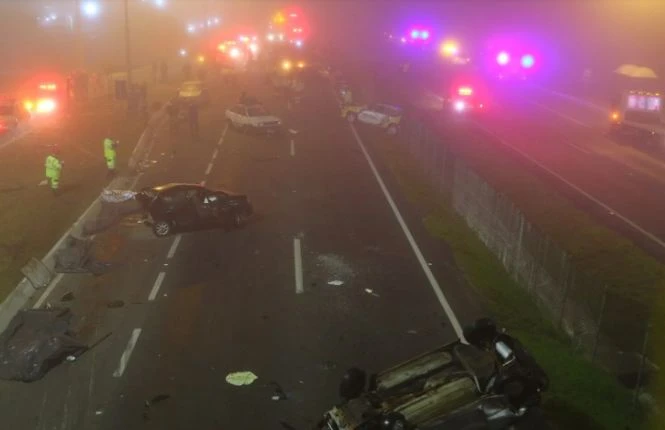 A BR-277, em São José dos Pinhais, foi palco de uma tragédia na noite deste domingo (02). Oito pessoas morreram e mais de 20 ficaram feridas. Entre os veículos envolvidos estão um caminhão, cinco motocicletas, uma viatura da Polícia Militar e 15 carros. Segundo motoristas que passavam pelo local, a visibilidade no trecho estava comprometida por conta de uma densa fumaça decorrente de um incêndio ambiental às margens da rodovia. Cerca de dez ambulâncias fizeram o atendimento às vítimas.