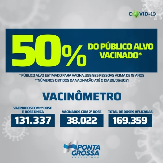 Ponta Grossa atingiu na última terça-feira, 29, o total de 50% do público alvo vacinado contra a COVID-19. A informação foi confirmada pela Prefeitura ontem, 30.