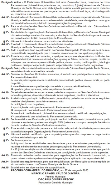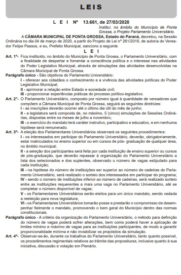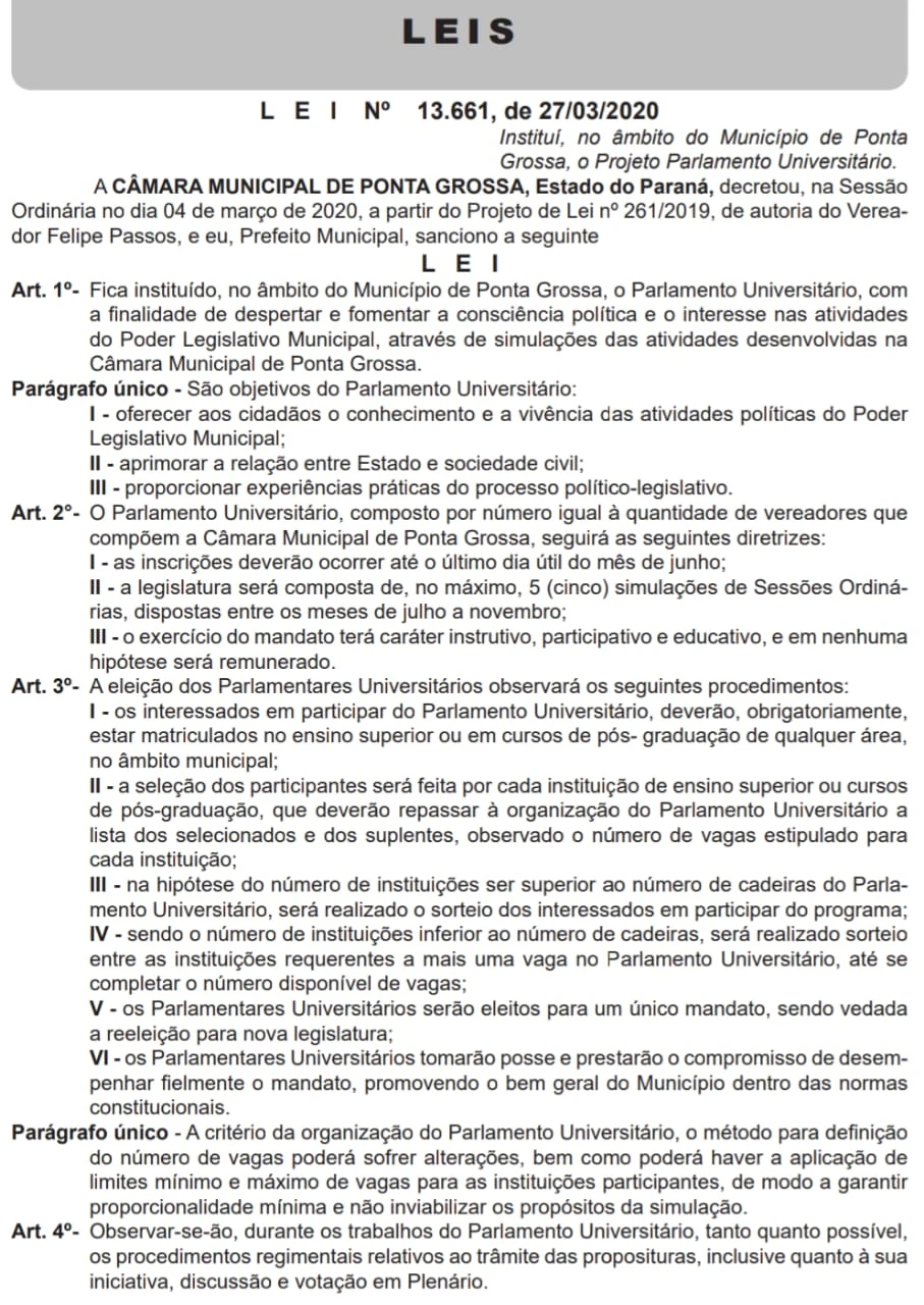 Confira o trecho completo do Diário Oficial do Município sobre o Parlamento Universitário: