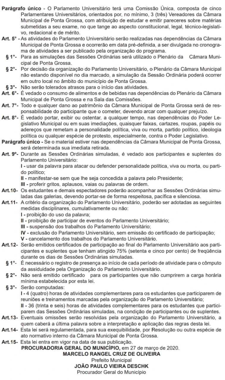 Na tarde desta segunda-feira (27), foi sancionado em Diário Oficial pelo prefeito Marcelo Rangel (PSDB), o Parlamento Universitário. A ideia tem como finalidade o despertar da consciência política e o interesse nas atividades do Poder Legislativo Municipal, através de simulações das atividades desenvolvidas na Câmara Municipal de Ponta Grossa.