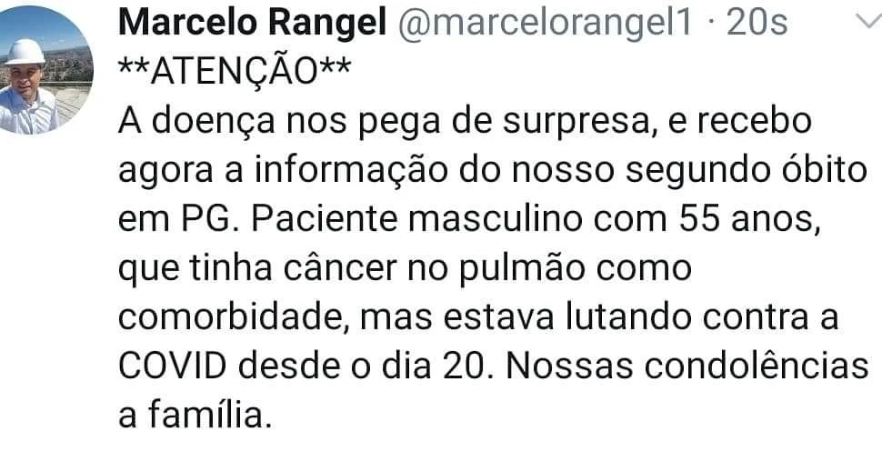A Prefeitura Municipal de Ponta Grossa confirmou na noite desta quinta-feira (02) a segunda morte pela Covid-19 no município. De acordo com o prefeito Marcelo Rangel, trata-se de um paciente, de 55 anos, que estava lutando contra um câncer no pulmão e, dede o dia 20, pelo coronavírus. O nome não foi revelado. O óbito deve ser contabilizado já no boletim desta sexta-feira (03).