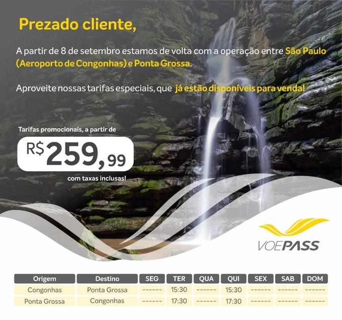 A companhia aérea VoePass, enviou um comunicado nesta segunda-feira (24), confirmando o retorno dos voos. Os dias dos voos serão terça e quinta-feira partindo de Ponta Grossa às 15h30 e de Congonhas às 17h30. O preço neste retorno é promocional, no valor de R$ 259,99.