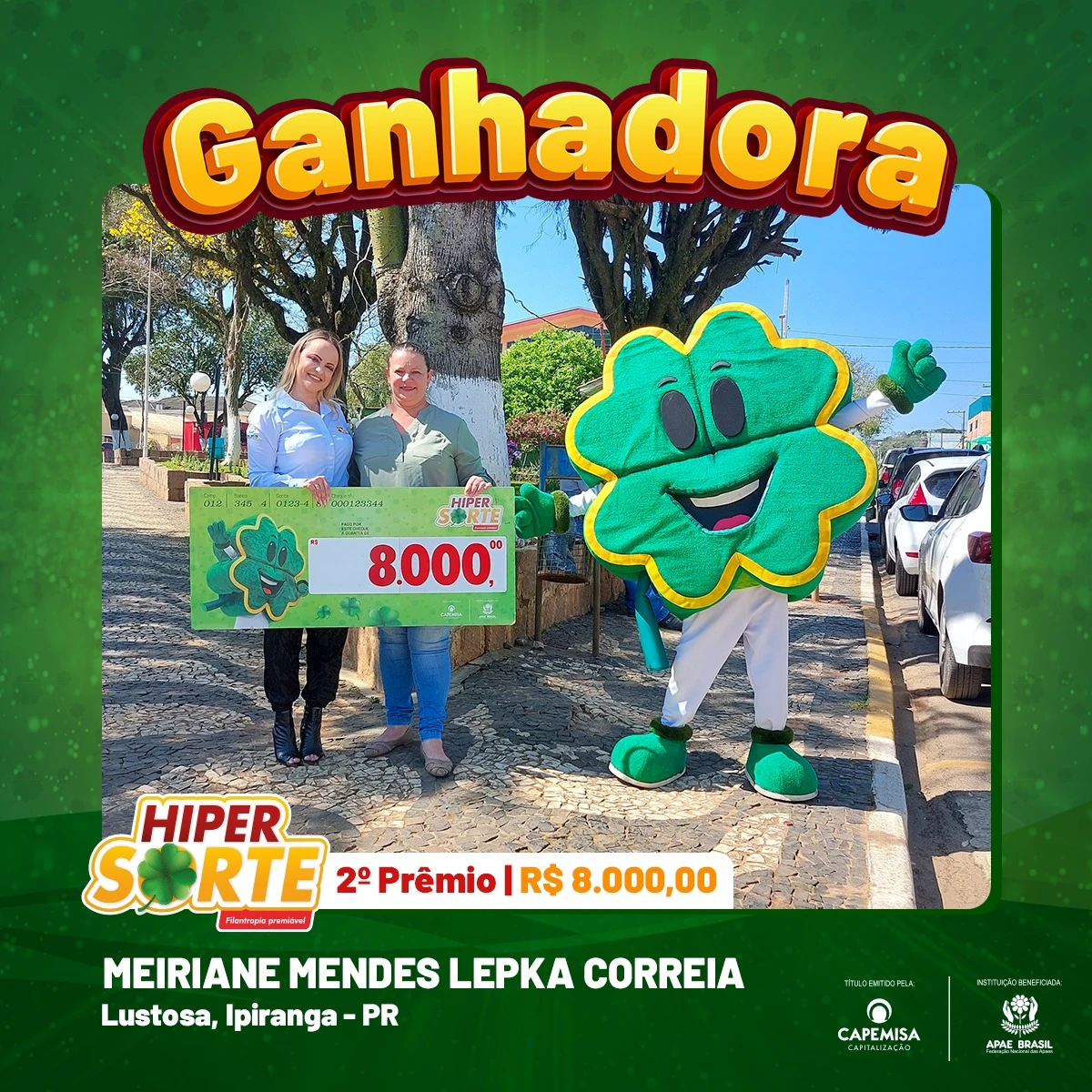 O segundo prêmio, de R$ 8 mil, foi para Meiriane Mendes Lepka Correia, de Ipiranga. O morador de Guarapuava, Alessandro Augusto de Oliveira, ficou com o terceiro prêmio, uma motocicleta Honda Bros.
