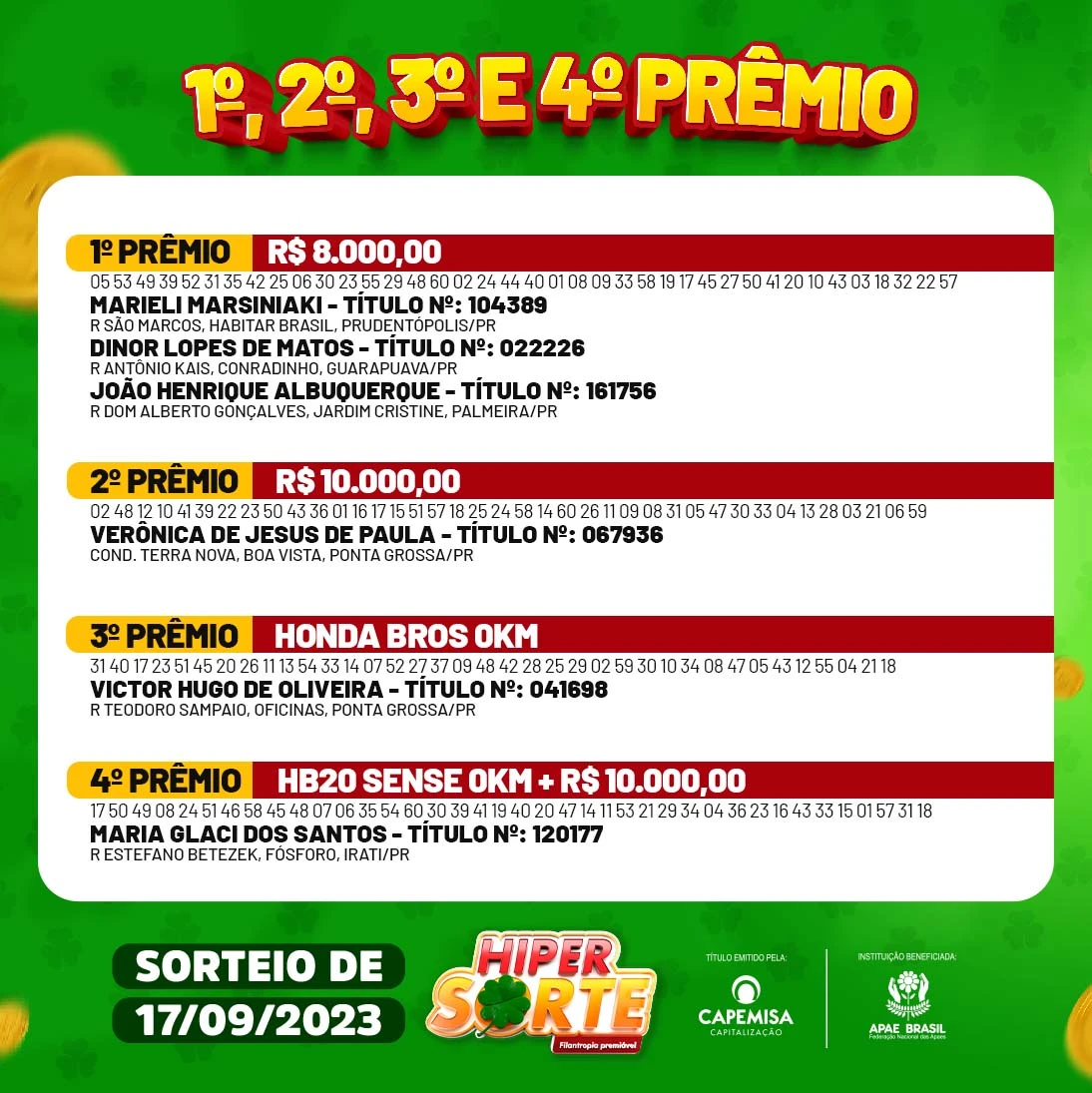 No sorteio realizado neste domingo (17) pelo Hiper Sorte, dois moradores de Ponta Grossa foram contemplados no segundo e terceiro prêmios.