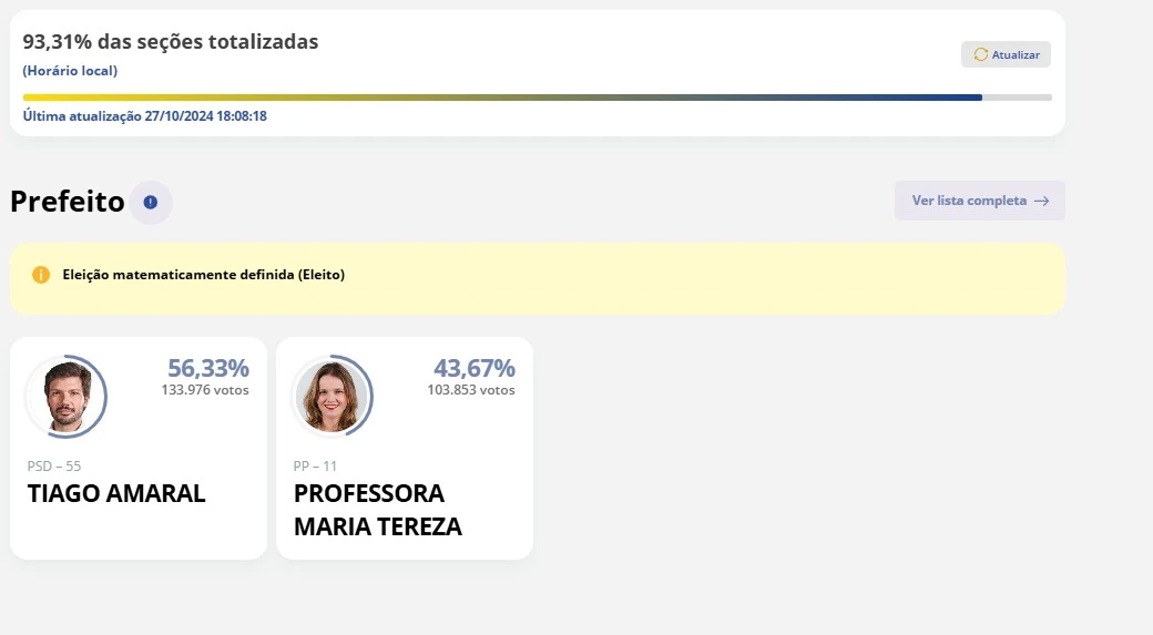 No momento, ele tem 56,33% dos votos, não podendo ser superado pela concorrente, Maria Tereza (PP).