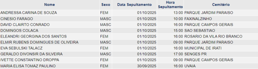 Falecimentos de 30/09/2025