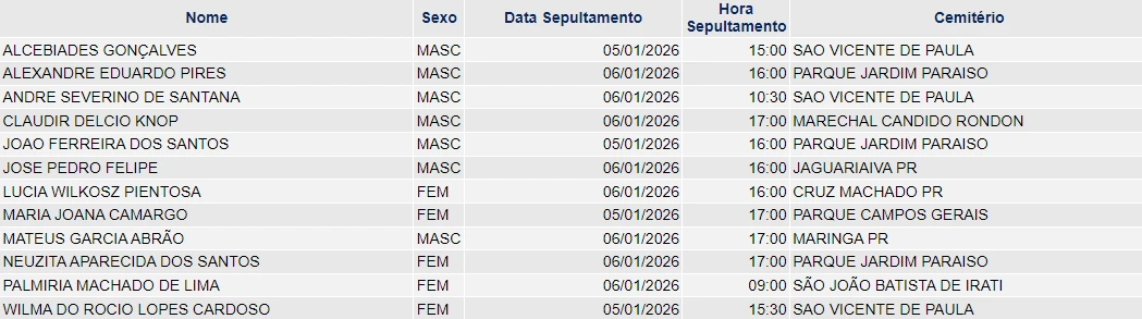 Falecimentos de 05/01/2026