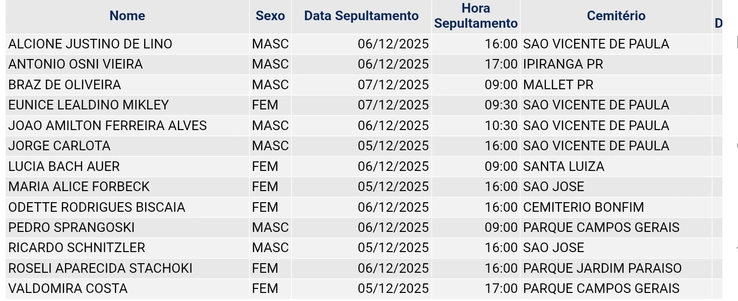 Falecimentos de 05/12/2025