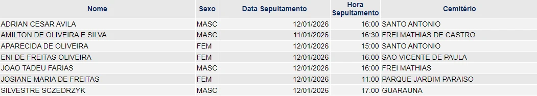Falecimentos de 11/01/2026