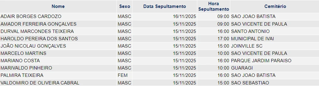 Falecimentos de 14/11/2025