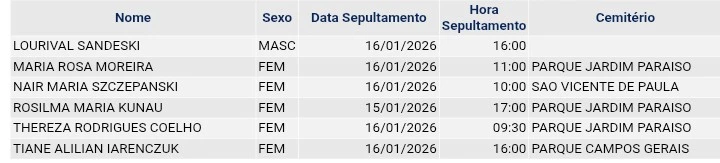 Falecimentos de 15/01/2026