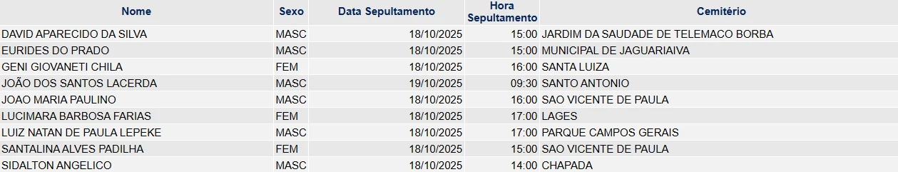 Falecimentos de 16/10/2025 informados pelo Serviço Funerário de Ponta Grossa