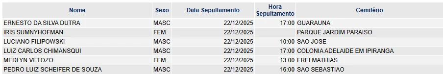 Falecimentos de 21/12/2025