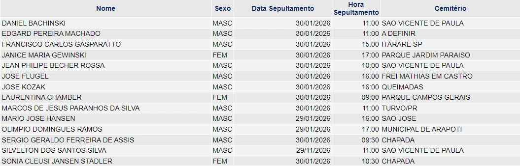 Clique aqui e veja os últimos falecimentos registrados em Ponta Grossa e região