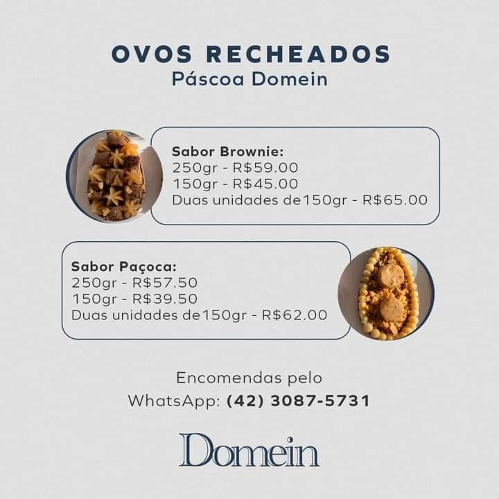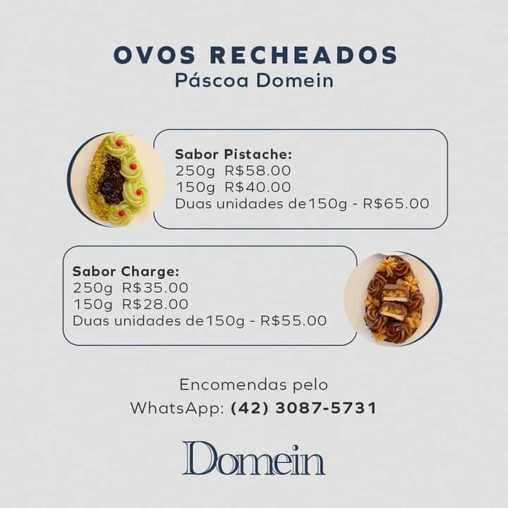 A data mais doce do ano está chegando e é claro que o Espaço Domein não vai ficar de fora! Com opções que agradam a todos os paladares, os ovos de colher recheados são opções ideais para degustar na Páscoa ou até mesmo presentear aquela pessoa especial. O cardápio deste ano tem quatro opções deliciosas de sabores: pistache, charge, paçoca e brownie. Os tamanhos disponíveis são de 150g, 250g e embalagem com duas unidades de 150g. As encomendas podem ser feitas até o dia 01/04 pelo WhatsApp: (42) 3087-5731. Confira as fotos e os valores: