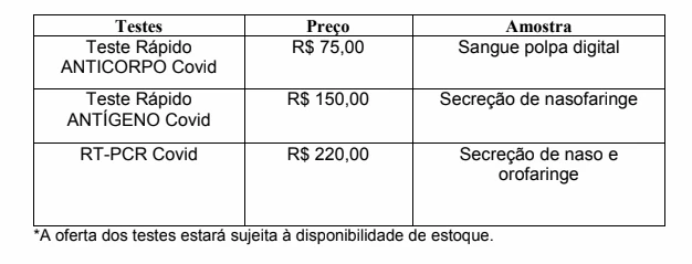Estarão disponíveis aos interessados os testes rápidos de anticorpo, antígeno e também o RT-PCR, e a previsão do resultado é de uma hora para os testes rápidos e três dias úteis para o RT-PCR.