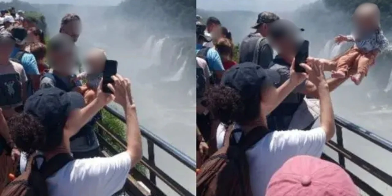 Um registro de extrema imprudência chocou visitantes e internautas na tarde desta terça-feira (17). Um homem foi flagrado segurando um bebê por cima das grades de proteção no mirante da Garganta do Diabo, no lado argentino das Cataratas do Iguaçu.