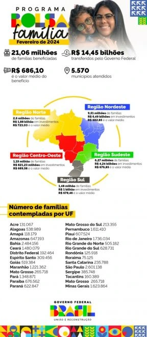 Na divisão por regiões, o Nordeste concentra o maior número de famílias beneficiárias em fevereiro de 2024. São 9,5 milhões de contempladas, a partir de um investimento de R$ 6,4 bilhões. Na sequência aparece o Sudeste, com 6,2 milhões de famílias e aporte de R$ 4,2 bilhões. A região Norte reúne 2,6 milhões de famílias, a partir de um investimento de R$ 1,8 bilhão. É no Norte que está o maior valor médio por beneficiário do país: R$ 723,03. No Sul, são 1,4 milhão de beneficiários e R$ 1 bilhão em investimento do Governo Federal. Por fim, a região Centro-Oeste concentra 1,1 milhão de famílias e um repasse de R$ 821 milhões.