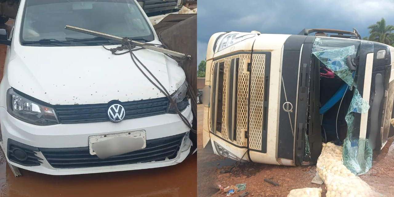 Para evitar uma colisão com um caminhão Volvo VM 270 — que vinha no sentido contrário e fazia uma conversão à esquerda para acessar a empresa Ibema —, o motorista da carreta perdeu o controle da direção e tombou na via de acesso.