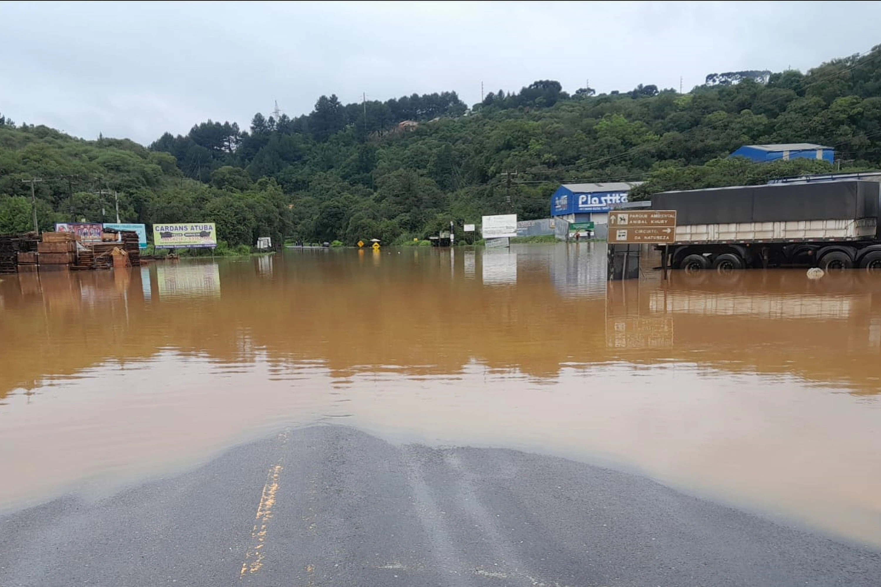PR-092 (Rodovia dos Minérios) em Almirante Tamandaré - Está com dois pontos de alagamento, com bloqueio das pistas no km 10, próximo ao entroncamento com o Contorno Norte de Curitiba, e no km 16, no perímetro urbano do município. Os locais contam com sinalização de emergência e as pistas serão avaliadas pelo DER/PR após o nível das águas baixar, para verificar possíveis danos.