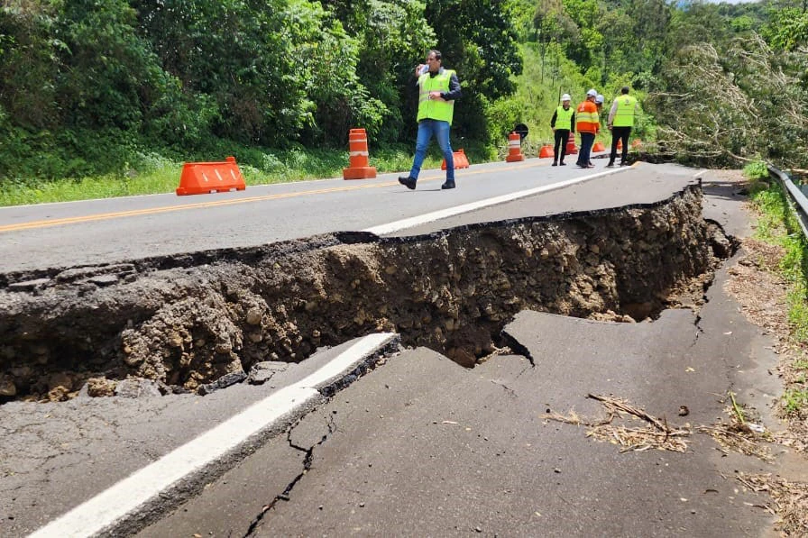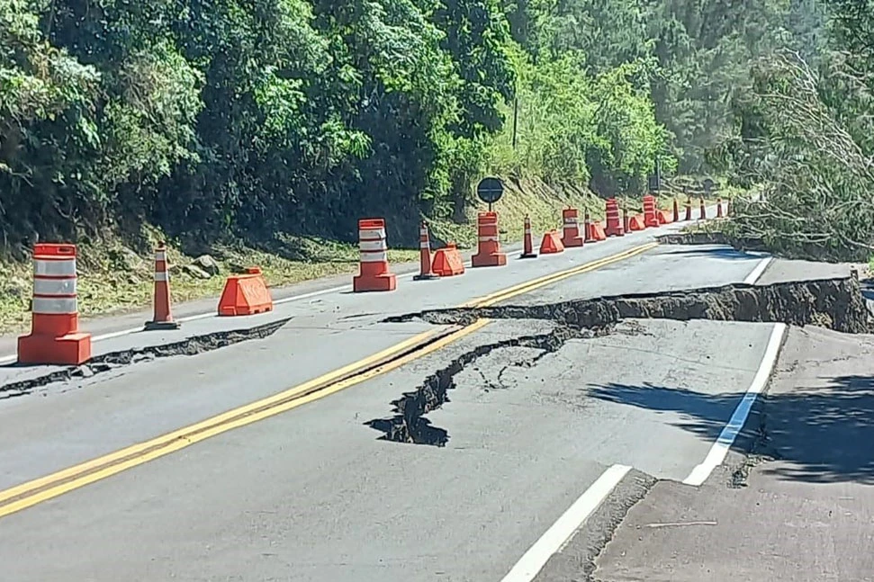 Neste ponto as rachaduras atingiram as duas pistas, causando desníveis de mais de um metro de altura no pavimento, instabilidade em todo o talude, e grandes riscos de colapso da rodovia, que poderiam ser agravados pelo tráfego de veículos pesados.