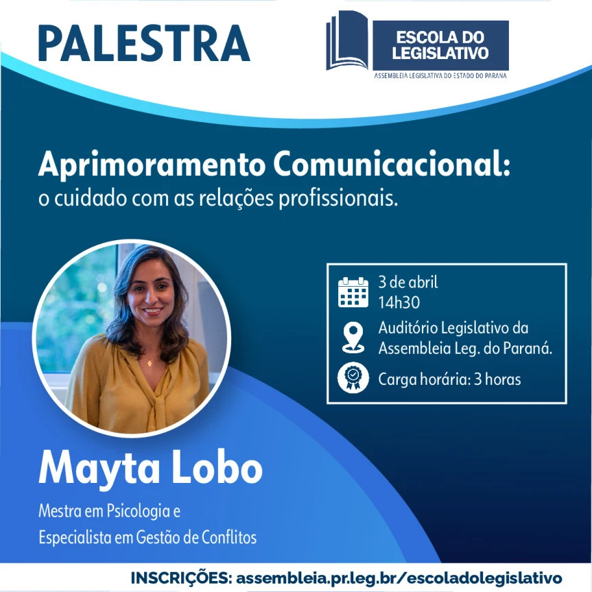 A Escola do Legislativo da Assembleia Legislativa do Paraná abriu as vagas para participação na palestra “Aprimoramento Comunicacional: O cuidado com as relações profissionais”, que será realizado no próximo dia 03 de abril, às 14h30, no Auditório Legislativo da Assembleia. O evento será aberto ao público e tem como objetivo orientar os participantes sobre os cuidados nas relações em ambientes de trabalho. Quem irá falar sobre o assunto é a mestre em psicologia e especialista em gestão de conflitos Mayta Lobo.