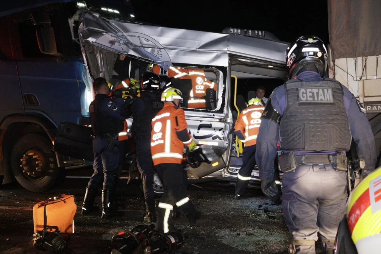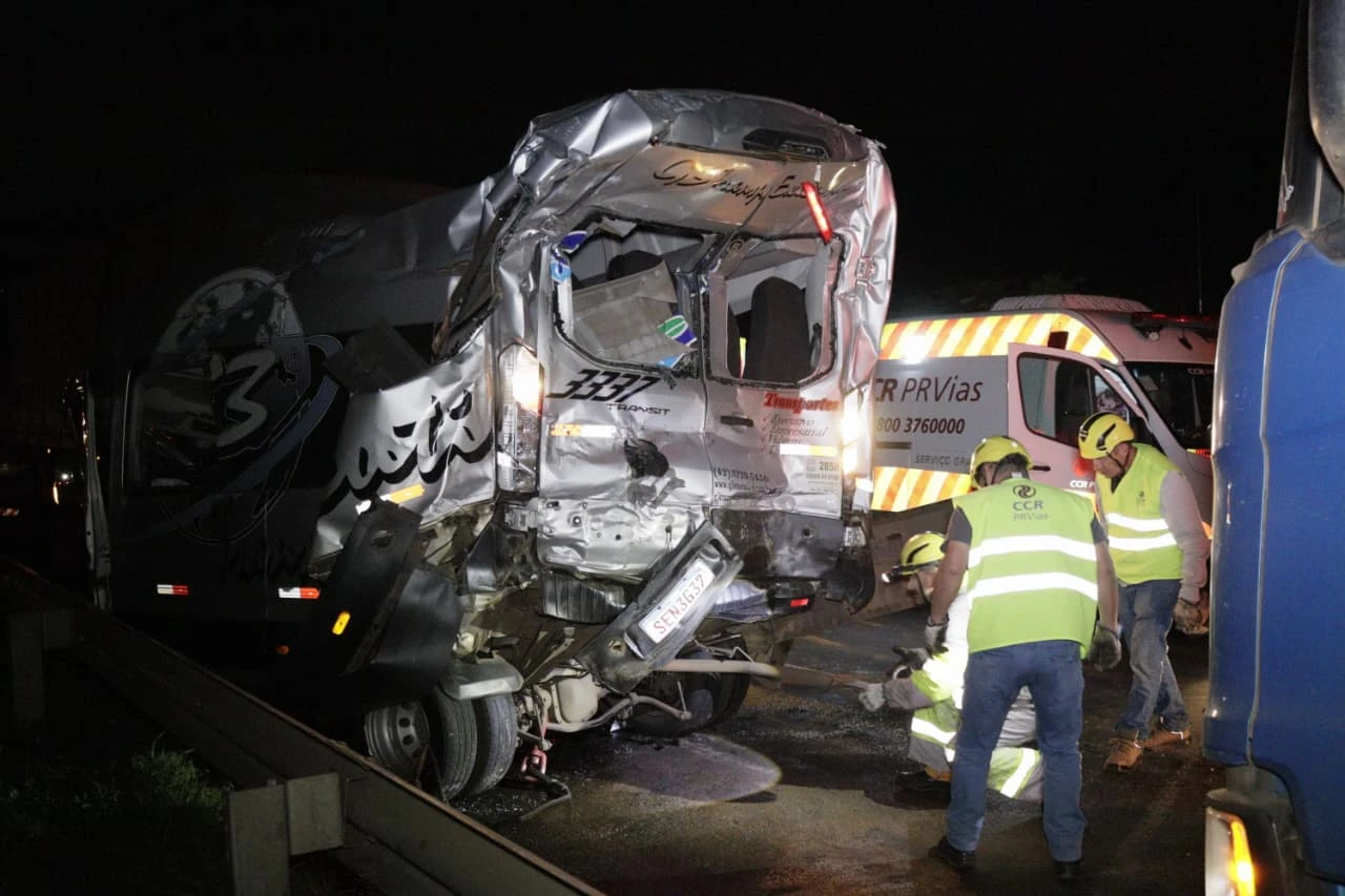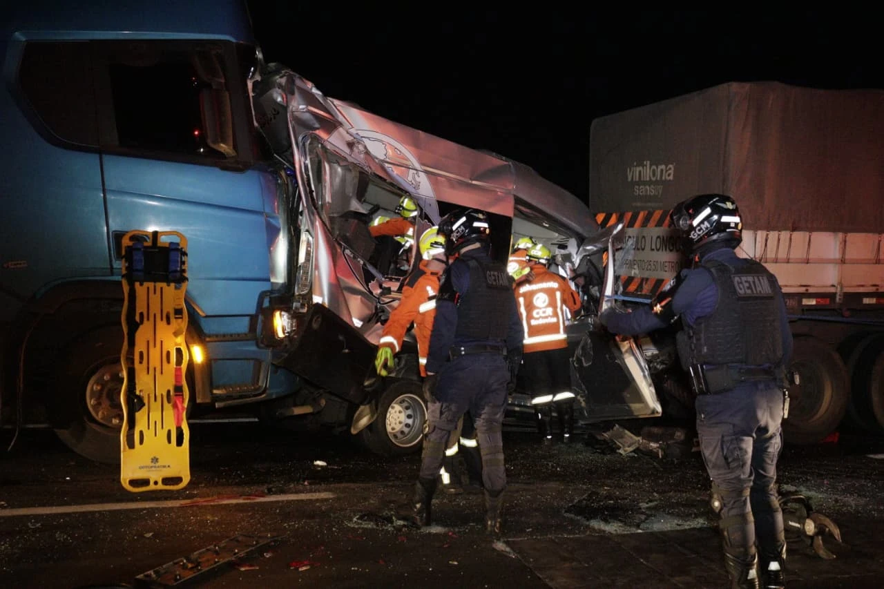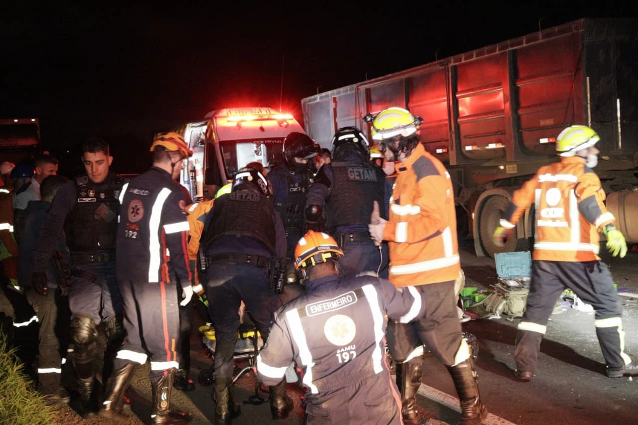 Um grave engavetamento registrado por volta das 23h30 de sexta-feira (14), no km 485 da BR-376, mobilizou equipes da Polícia Rodoviária Federal (PRF) e serviços de socorro em Ponta Grossa. O acidente envolveu dois caminhões e uma van de passageiros e ocorreu em trecho onde havia obras de recomposição de pavimento, situação que provocava lentidão e congestionamento na rodovia.