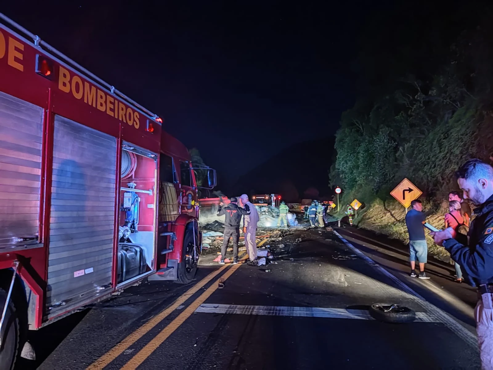 Segundo o Corpo de Bombeiros, a batida envolveu dois caminhões e cinco veículos leves. Um caminhão envolvido no acidente perdeu os freios na descida da serra e, para evitar bater nos veículos que estavam na frente, invadiu a pista contrária, colidindo com o carro onde estavam as vítimas. O veículo pegou fogo e ficou totalmente destruído.