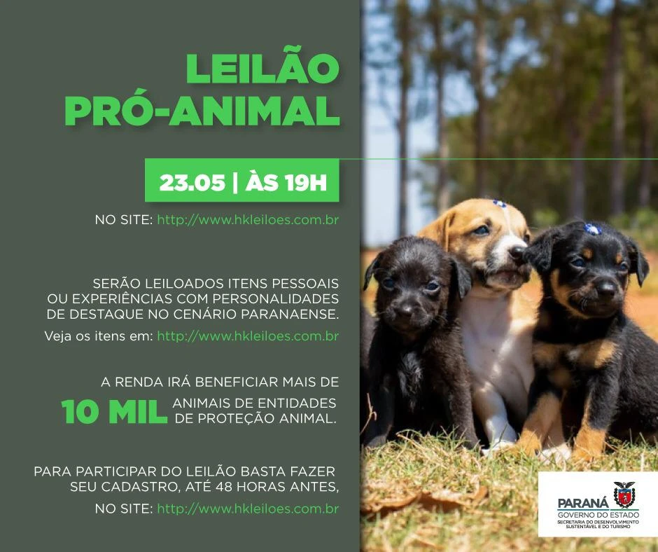O secretário estadual de Turismo e Desenvolvimento Sustentável, Márcio Nunes, anunciou em seu perfil no Instagram, na manhã desta quarta-feira (20), um leilão online que deve arrecadar dinheiro para entidades de proteção animal do estado do Paraná.