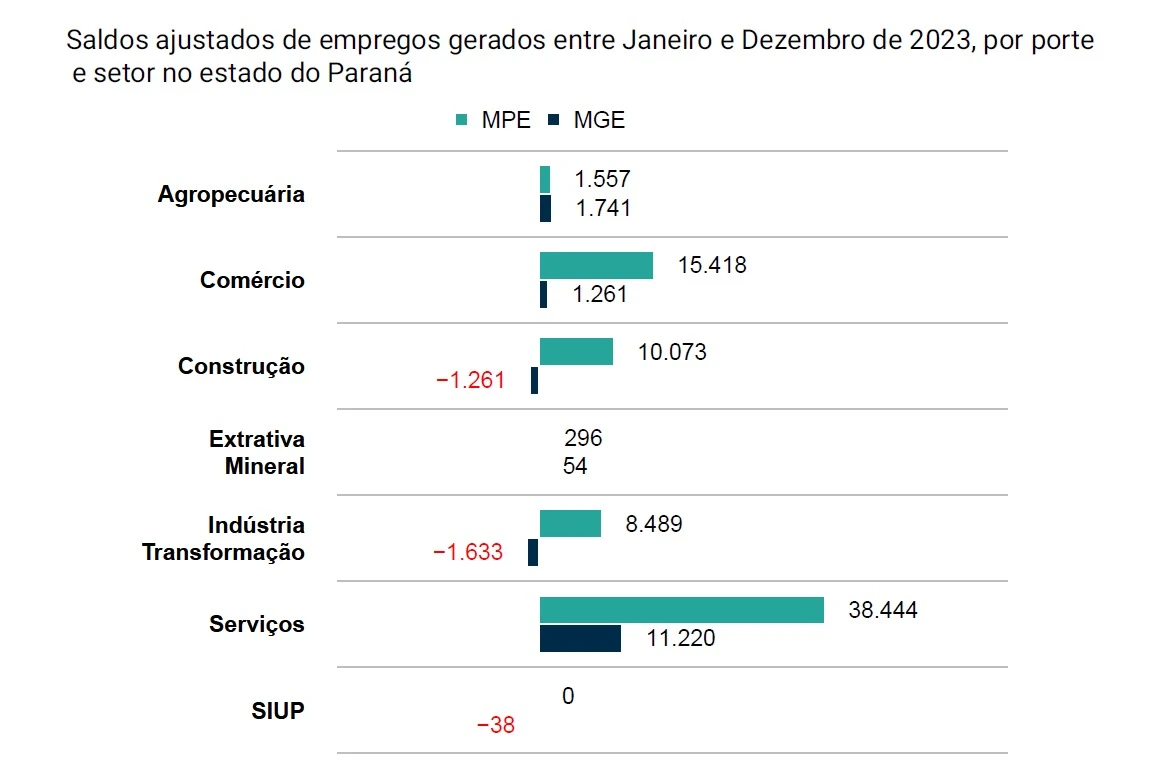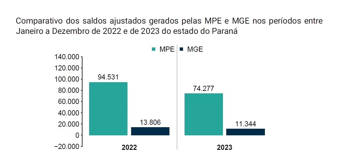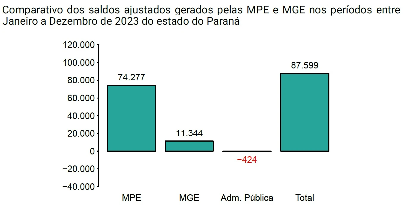 Entre janeiro e dezembro de 2023, as empresas paranaenses registraram saldo positivo de 87.599 novos postos de trabalhos. Neste contexto, as micro e pequenas empresas foram responsáveis por 84,7% do montante, com 74.277, seguidas por empresas de médio e grande porte, com 11.344. A Administração Pública teve retração, com 424 vagas a menos.