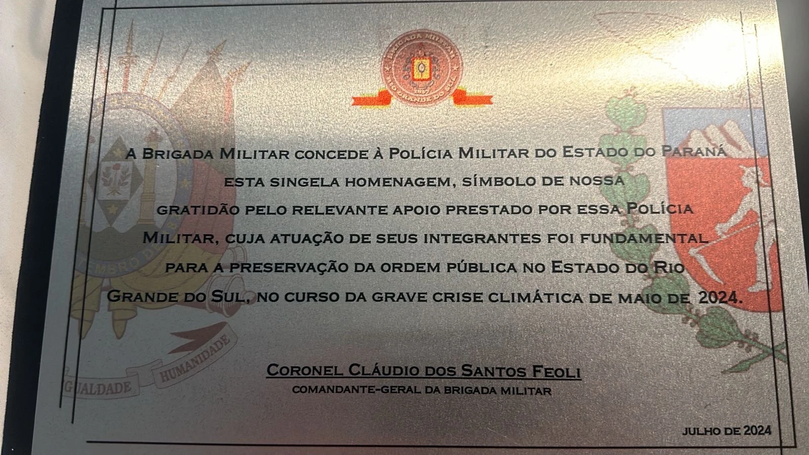 A Polícia Militar do Paraná (PMPR) foi homenageada, na sexta (26) pelo Comandante-Geral da Brigada Militar do Rio Grande do Sul, Coronel Cláudio dos Santos Feoli, pelo apoio prestado durante a grave crise climática que acometeu o estado gaúcho.
