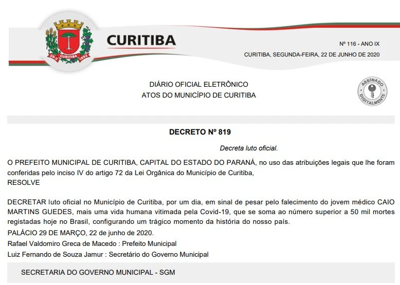 O prefeito de Curitiba, Rafael Greca, decretou luto de um dia em homenagem às vítimas fatais da Covid-19. O decreto foi publicado nesta segunda-feira (22) e lembrou do óbito do médico Caio Martins Guedes, de 33 anos.Rafael Greca decreta luto de um dia em homenagem às vítimas fatais da Covid-19