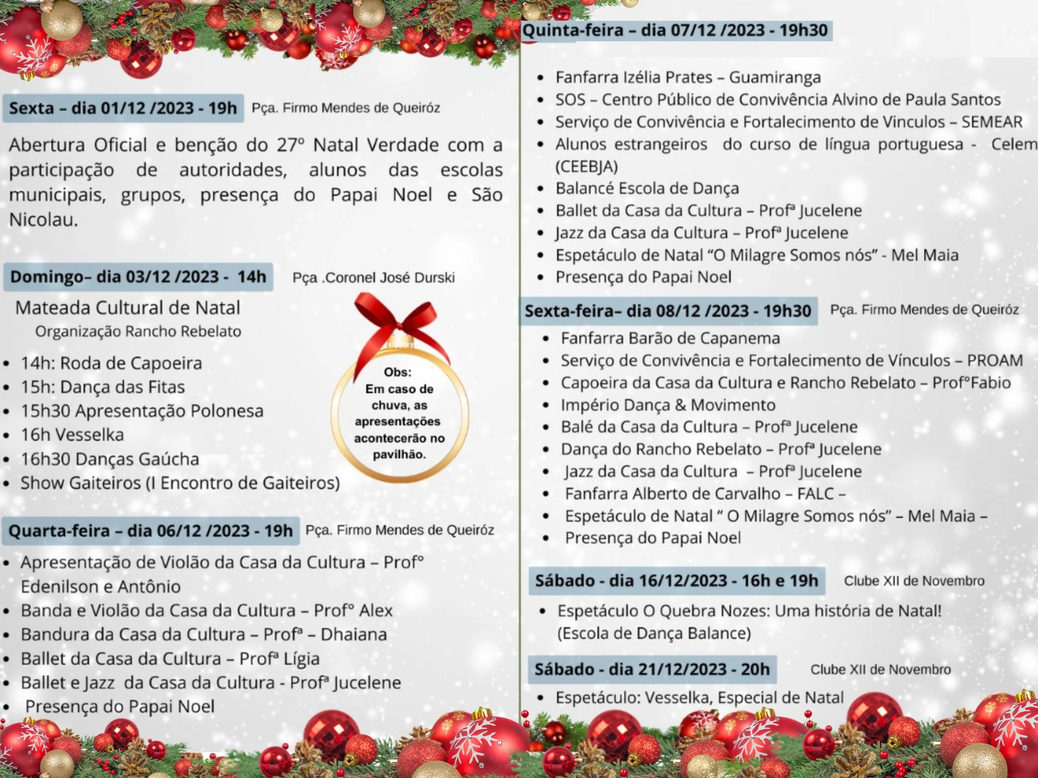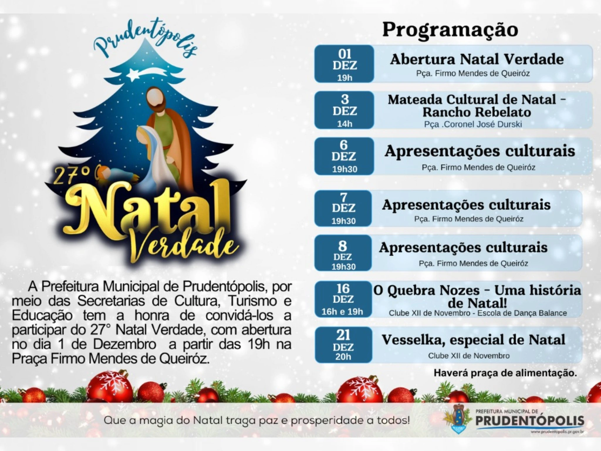 A Prefeitura Municipal de Prudentópolis, por meio das Secretarias de Cultura, Turismo e Educação, convida a população para participar do 27º Natal Verdade, com abertura no dia 01 de dezembro, a partir das 19h, na Praça Firmo Mendes de Queiróz.